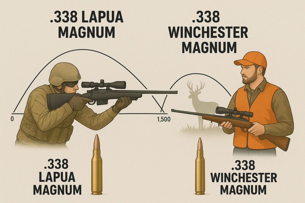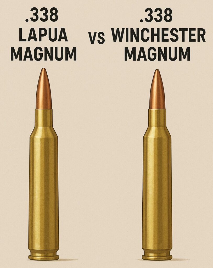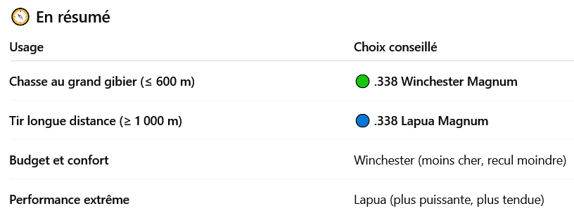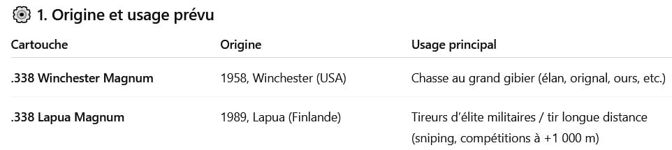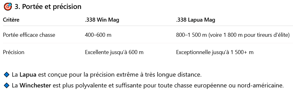 « La 338 Lapua Magnum et la 338 Winchester Magnum sont deux cartouches de calibre similaire (toutes deux utilisent des balles de 8,6 mm), mais elles diffèrent nettement en puissance, portée, usage et conception. Voici une comparaison claire » :