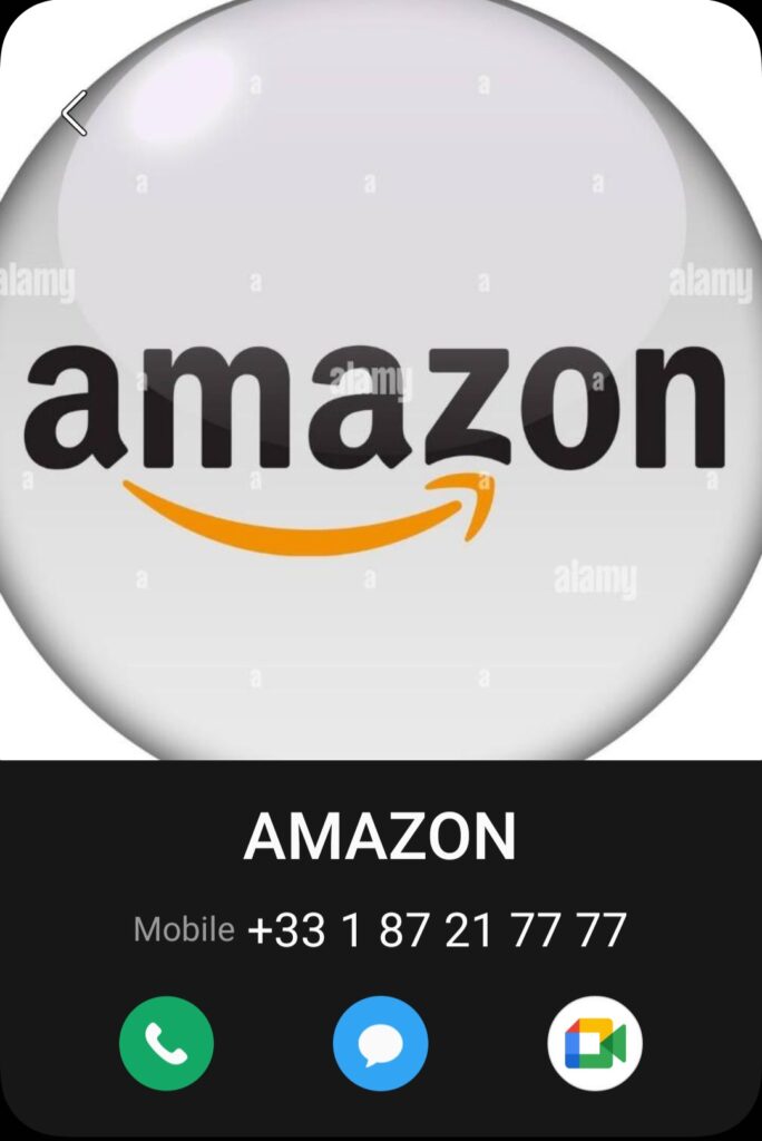 Donc pour que le livreur puisse vous contacter créer un nouveau contact dans le téléphone : « AMAZON » +33 1 87 21 77 77. Si vous recevez d’autres appels d’AMAZON portant un autre numéro, ajoutez les dans la fiche contact. Pour simplifier encore plus la reconnaissance lors de l’appel, je charge la photo du logo AMAZON et je la met pour illustrer le contact.