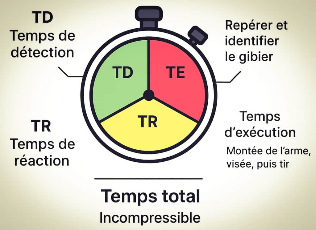 Dans la chasse en battue, afin d’obtenir un tir rapide et efficace il faut comprendre que tout se décompose en trois temps : Le « Temps de Détection » TD, le « Temps de Réaction » (TR) et le «